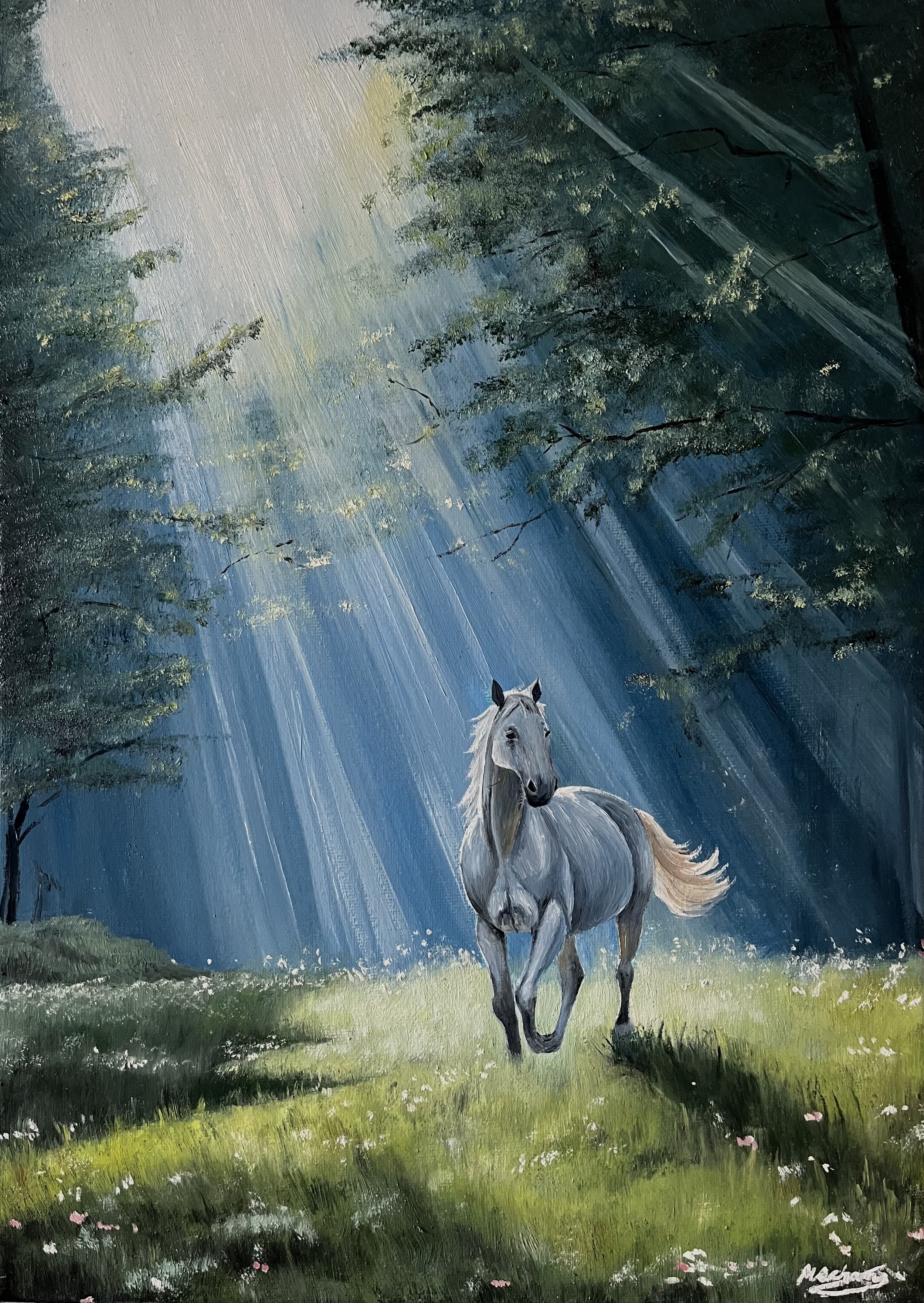 “White Horse In A Sunlit Forest” Original Oil Painting